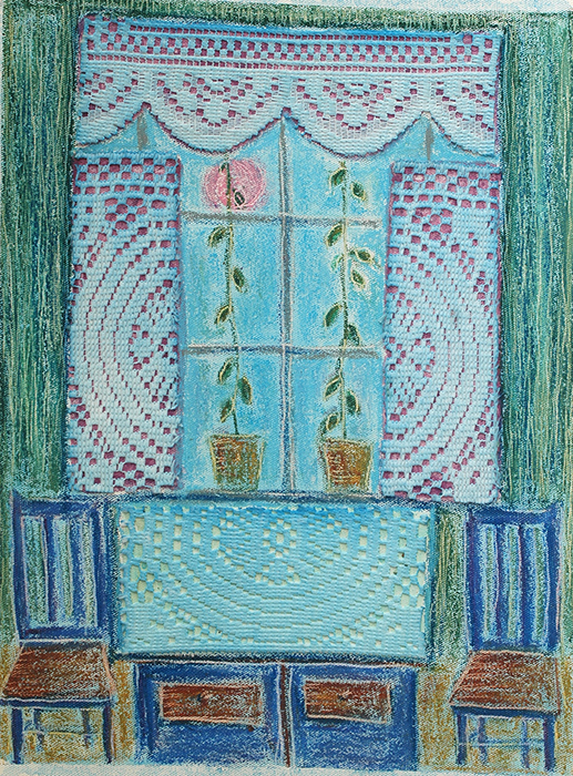 Blue dress and lace curtains 9 agosto 2025 517 × 700 Paula Mikkilä from Finland, between past and present, a journey into art with a capital A