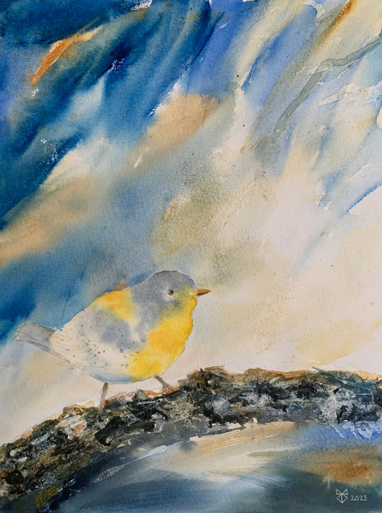 Merja Sipiläinen-Kuhlberg – Chirping, 27×35 cm, 2023, watercolor 10 novembre 2025 1600 × 2149 Meria Q aka Merja Sipiläinen-Kuhlberg, a mysterious artist who believes in miracles created by the free flow of the mind Meria Q – Chirping, 27×35 cm, 2023, watercolour