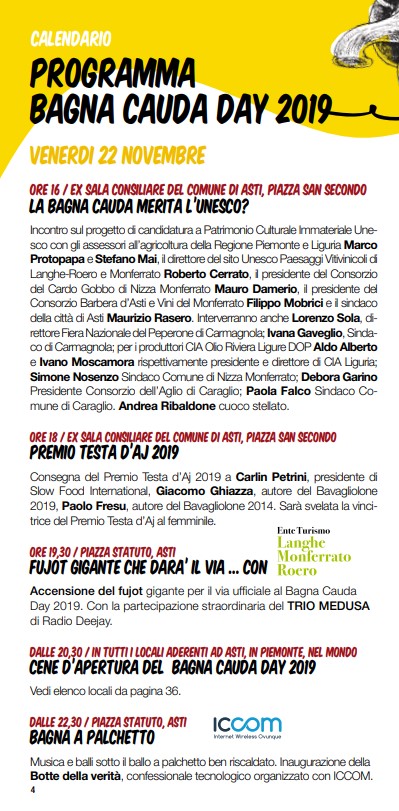 Bagna Cauda Day programma 1 22 novembre 2019 399 × 811 Asti – 13° edizione del Bagna Cauda Day 21,22, 23 e 28,29 e 30 novembre 2025