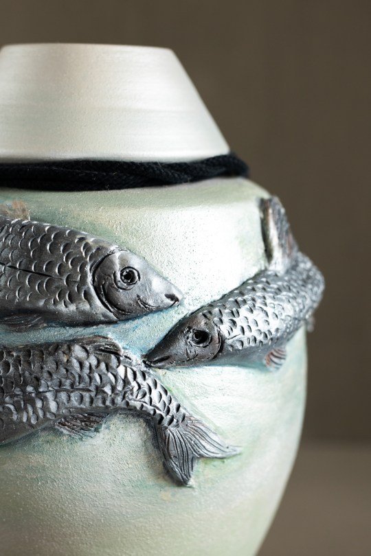 Personoitu uurna, tuhkauurna, vesistöuurna, www.tierrafinlandia.fi, kauppa.tierrafinlandia.fi, Siika 1 17 gennaio 2026 4480 × 6720 Pia Zettinig with Tierra Finlandia shapes life through clay Siika: Dreamer of a free spirit (Silver fish around the base)